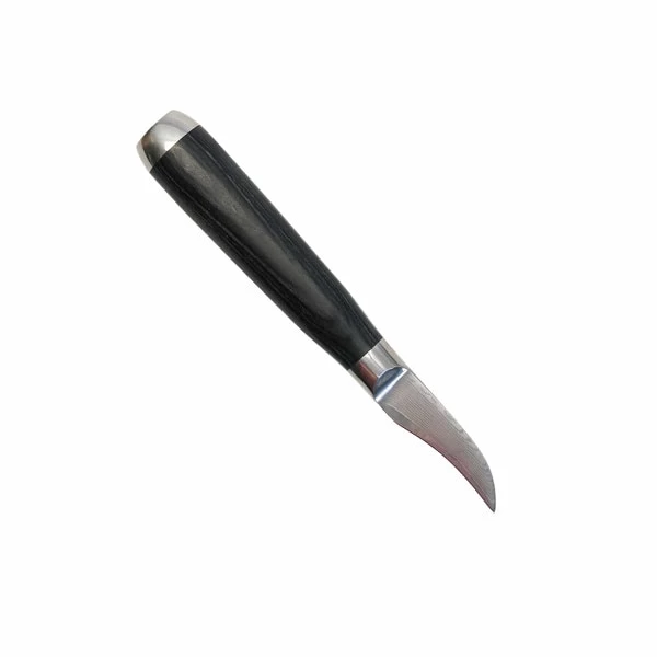 Both Damascus Trim Knives feature a Pakka-Wood handle. The grain is clearly visible on the handle of the curved blade, but the handle on the straight blade has a slightly darker color, which makes the grain a little less visible.