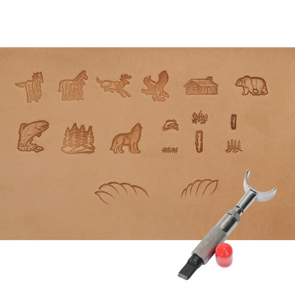 At last! A set of stamping tools and 3-D stamps that makes turning out professional looking leather work fast, easy and potentially profitable. These tools will give beginners and resellers alike the ability to create rich looking, hand tooled products such as wallets, belts, journals, and other personal items for gifts or resale. Tools are guaranteed for life! (*under normal use) Deluxe 16 piece set includes non-adjustable swivel knife, six stamping tools (F110, F111, F113, F114, F115, F116), and nine 3-D stamps (011-882002 Four Trees, 011-8847500 Wolf-Right, 011-8830901 Leaping Deer-Right, 011-8834500 Trout, 011-8842100 Log Cabin, 011-8830100 Landing Eagle-Right, 011-8831600 Mare & Colt, 011-8831100 Running Horse-Right, 011-8830300 Bear). Hefty Handle needed for 3D stamps sold separately.