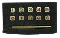 1/4″ Number Stamp Set: Bold and vivid open face style. Numbers 0-9, plus handle. Item #011-1110.